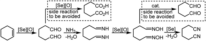 There are recent examples of synthesizing adiponitrile from cyclohexene. For instance, the reaction of cyclohexene with H2O2 can readily generate cyclohexane-1, 2-diol [13], which can be transformed into adiponitrile through the ammoxidation reaction [14]. Adiponitrile was also synthesized through the ammoxidation reaction of cyclohexanol, which was the hydration product of cyclohexene [15]. In our case, we have declared a patent on the selenium-catalysed ammoxidation reaction of cyclohexene to produce adiponitrile directly [16]. Indeed, as depicted in Scheme 1, the reaction was constituted by several steps of unit reactions, such as the selenium-catalysed oxidative cracking reaction of alkene [17-21], the amination of carbonyls, the oxidation of imine to aldoxime, and the selenium-catalysed dehydration of aldoxime to nitrile [22, 23]. How to inhibit side reactions, such as the over oxidation of aldehydes into carboxylic acids as well as the deoximation reaction, is the key to this technique (Scheme 1). The inhibition of the deoximation reaction confronts formidable challenges. As reported in the existing research, this reaction is prone to occur under oxidative conditions. Chalcogen elements (including both Se and Te), metals, free radical initiators, and even its carbonyl products can all act as catalysts for this transformation [24-30].