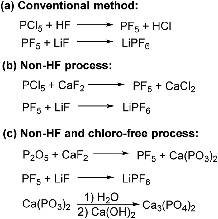 LiPF6 is currently the main commercial electrolyte salt for lithium-ion battery electrolyte. In the conventional approach, the reaction of PCl5 with HF initially yields PF5, and the subsequent reaction of PF5 with LiF leads to LiPF6 (Scheme 2, method a). Guided by the ETR theory, we contemplated that the fluorination reaction of PCl5 could directly employ CaF2 as the fluorinating reagent since there are two types of driving forces in the reaction: Firstly, the generated P-F in the product PF₅ is relatively more stable than P-Cl in the PCl₅ reactant; Secondly, the generated PF₅ is in a gaseous state and can be removed from the reaction system, which may continuously drive the reaction in the direction of generating PF₅. This new concept of non-HF production of LiPF₆ has been successfully industrialized in 2019 (Scheme 2, method b) [31].