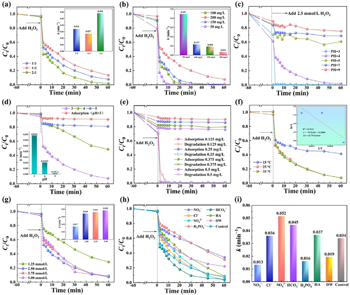 Figure 3.  (a) The catalysis performance of MHC prepared with different proportions; the inset is degradation rates. The effect of initial TC concentration (b), pH (c, d), dosage (e), temperature (f), H2O2 concentration (g), and co-existing anions (h, i) via MHC on Fenton-like degradation performance.
