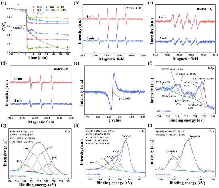 Figure 4  (a) Active species quenching experiments. ESR spectra of O2ˉ (b), OH (c), and 1O2 (d) respectively. (e) ESR signals of MHC. XPS spectra of Fe 2p (f), O 1s (g), C 1s (h), and N 1s (i) of samples after reaction.