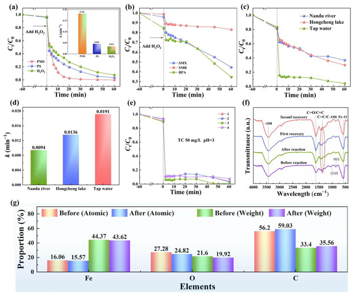 Figure 6.  (a) Effects of oxidants on MHC system. (b) The degradation effect of MHC on different pollutants. (c, d) The degradation of TC by MHC in different water matrices and the corresponding reaction rate. (e) Continuous cyclic degradation test. (f) FT-IR spectra of fresh and used samples. (g) The change of catalyst composition before and after reaction.
