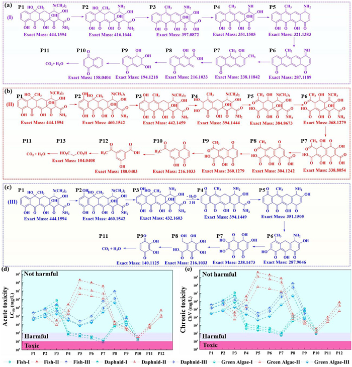 Figure 7.  (a–c) Degradation pathways of TC in the MHC system. Acute toxicity (d) and chronic toxicity (e) of degradation intermediates to daphnia, green algae, and fish.