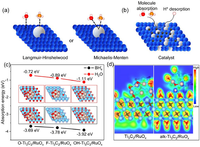 Figure 1.  (a) Schematic diagrams of the Langmuir-Hinshelwood model and the Michaelis-Menten model for the adsorption of H2O molecules and BH4 anion on the catalyst surface. (b) Schematic diagram of the adsorption of H2O molecules and BH4 anion induced by -OH functional groups. (c) The adsorption energies of H2O molecules and BH4 anion on O-Ti3C2/RuOx, F-Ti3C2/RuOx, and OH-Ti3C2/RuOx. (d) The electron localization function (ELF) calculations on Ti3C2/RuOx and alk-Ti3C2/RuOx, respectively.