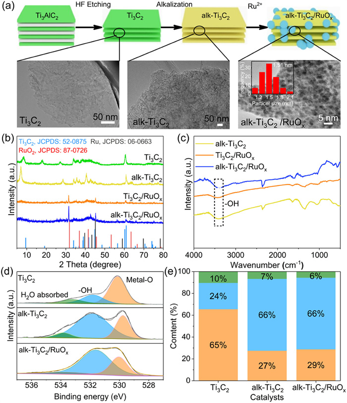 Figure 2.  (a) Schematic diagram of the preparation process for alk-Ti3C2/RuOx and corresponding TEM images of the intermediate products. (b) XRD patterns of Ti3C2, alk-Ti3C2, Ti3C2/RuOx and alk-Ti3C2/RuOx. (c) FTIR spectra of alk-Ti3C2, Ti3C2/RuOx and alk-Ti3C2/RuOx. (d) High-resolution XPS spectra of O 1s in the Ti3C2, alk-Ti3C2 and alk-Ti3C2/RuOx. (e) Statistics of the contents of different species in the O 1s region of the XPS spectra.