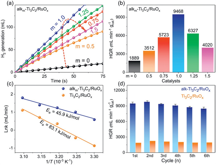 Figure 3.  (a) The equivalent H2 of NaBH4 versus time with different molar ratios of -OH and (b) the corresponding HGR performance. (c) The summarized Arrhenius plots of Ti3C2/RuOx and alk-Ti3C2/RuOx at different reaction temperatures for NaBH4 hydrolysis. (d) Reusability tests of Ti3C2/RuOx and alk-Ti3C2/RuOx.
