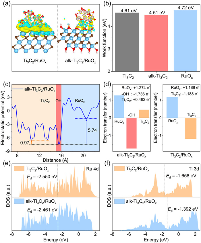 Figure 4  (a) Charge-density difference diagram of Ti3C2/RuOx and alk-Ti3C2/RuOx. (b) Work functions of Ti3C2, alk-Ti3C2, and RuOx from UPS spectroscopy. (c) Plane averaged electronic potential along the perpendicular direction of alk-Ti3C2/RuOx. (d) Bader charge calculation of the charge transfer amounts for different species in alk-Ti3C2/RuOx and Ti3C2/RuOx. PDOS plots of Ru (e), Ti (f) in alk-Ti3C2/RuOx and Ti3C2/RuOx, respectively.