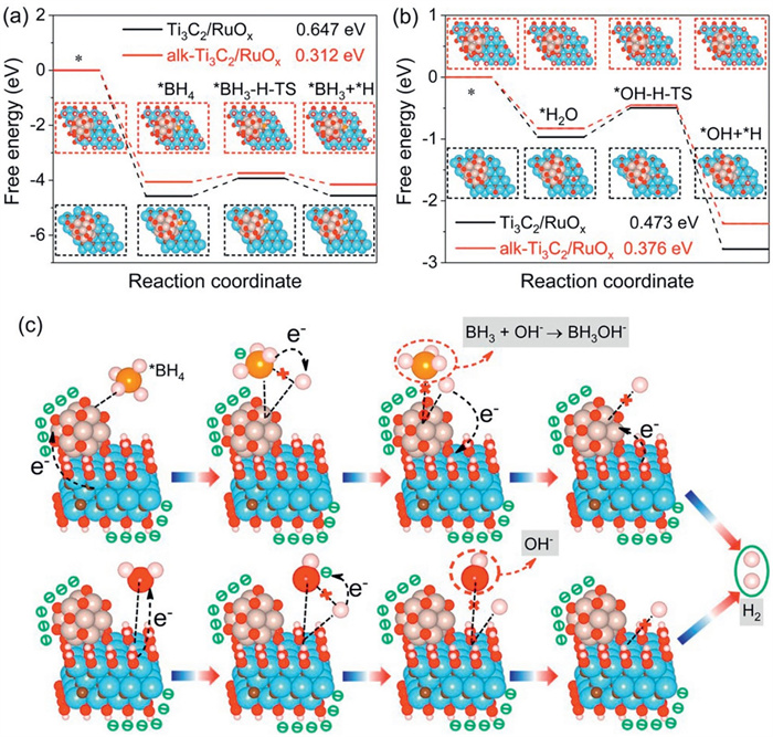 Figure 5  The cleavage activation energies of (a) NaBH4 and (b) H2O molecules of alk-Ti3C2/RuOx and Ti3C2/RuOx catalysts calculated by DFT. (c) Catalytic mechanism diagram for the hydrolysis of NaBH4 to generate H2 using the alk-Ti3C2/RuOx catalyst.
