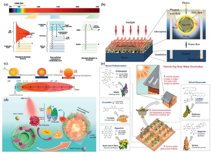 Figure 2 Generalization of the photothermal water disinfection mechanism. (a) Photothermal effects of different mechanisms with corresponding light absorption ranges. Reprinted with permission [26]. Copyright 2019, The Royal Society of Chemistry. (b) Schematic diagram of the photothermal conversion process. Reprinted with permission [30]. Copyright 2017, Elsevier. (c) Schematic diagram of the photothermal conversion mechanism. Reprinted with permission [32]. Copyright 2021, Wiley. (d) Synergistic killing of bacteria by ROS and photothermal effect under 660 nm light irradiation. Reprinted with permission [41]. Copyright 2021, Elsevier. (e) Conceptual diagram of farm to tap water treatment plant water treatment. Photosensitizers and dispersants are extracted from the plant by boiling or other simple methods and added to the water, which is placed in sunlight for disinfection. Reprinted with permission [36]. Copyright 2020, American Chemical Society.