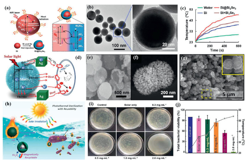 Figure 3 (a) Schematic synthesis and mechanism of Bi@Bi2Se3 NPs with enhanced photothermal properties. (b) TEM image of Bi@Bi2Se3 NPs. (c) Temperature rises curves of Bi, Bi@Bi2Se3 and Bi@Bi2Se3 NPs under 808 nm laser irradiation. (a-c) Reproduced with permission [22]. Copyright 2020, The Royal Society of Chemistry. (d) Mechanism of inactivation of E. coli by Ag/MnO2 PHMs under solar irradiation. (e) SEM image of 0.3% Ag/MnO2 PHMs. (f) TEM image of 0.3% Ag/MnO2 PHMs. (d-f) Reproduced with permission [23]. Copyright 2019, Elsevier. (g) SEM image of Fe3O4@PB NPs. (h) Schematic of Fe3O4@PB NPs for recyclable photothermal water sterilization under primary solar irradiation. (i) Photographs and (j) relative viability of total colonies in contaminated tap water treated with different concentrations of Fe3O4@PB dispersions and irradiated by the sun for 15 min. (g-j) Reproduced with permission [50]. Copyright 2019, Elsevier.