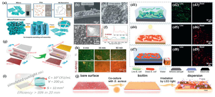 Figure 4 (a) Schematic of the synthesis of MXene/PVA/HA aerogel. SEM images of the top surface of the MXene composite aerogel at (b) low and (c) high magnification. (d1) Schematic showing the accumulation of E. coli on the surface of the FTCS-MXene /PVA/HA aerogel after exposure to E. coli contaminated medium for 30 min. FTCS-MXene /PVA/HA aerogel (d4) under open sunlight and (d7) Schematic representation of the antifouling properties after polarization with a water thickness of 5 mm. E. coli fluorescence images of FTCS-MXene / PVA/HA aerogels (d2 and d3) in the pristine state, (d5 and d6) under open-air solar irradiation for 10 min, and (d8 and d9) after potential polarization for 30 min. (a-d) Reprinted with permission [53]. Copyright 2023, The Royal Society of Chemistry. (e) SEM images of Ti-RP/GO. (f) Raman spectra of Ti-RP, Ti-GO, and Ti-RP/GO samples. (g) Schematic diagram of the RP/GO membrane synthesis process. (h) Fluorescence measurement of S. aureus biofilm after LED light irradiation. Green color represents live bacteria and red color represents dead bacteria. (i) Schematic diagram of the antibacterial test for Ti-RP/GO light-driven inactivation. (j) Schematic of Ti-RP/GO biofilm dispersion. (e-j) Reproduced with permission [54]. Copyright 2020, Elsevier.