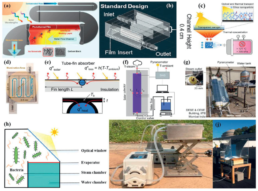 Radiation sterilization reactors represent an alternative class of photothermal systems, relying on prolonged sunlight exposure to catalyze the production of reactive oxygen species, which degrade microbial proteins. These reactors leverage large-area solar collectors to maximize light absorption and achieve the desired antimicrobial effect [60]. Zhao et al. [61] introduced an innovative radiation reactor design utilizing a conventional tube and fin absorber. At temperatures exceeding 100 ℃, radiative heat transfer predominates, rendering this design independent of extensive solar collectors and tracking systems. This reactor is capable of producing steam at temperatures above 120 ℃, which significantly enhances sterilization efficacy. The radiation reactor's benefits include reduced reliance on light intensity and robust performance across varying weather conditions, underscoring its practical applicability and potential for widespread use (Figs. 5c, 5e-g).