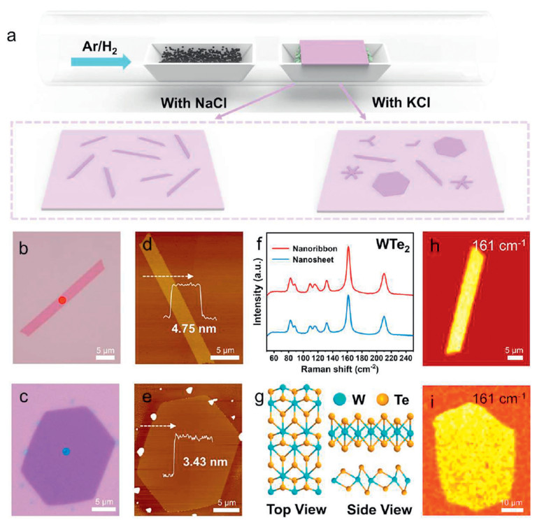Figure 1.  Synthesis and characterizations of CVD-grown WTe2. (a) Schematic diagram of the CVD growth process. (b, c) OM images of as-grown WTe2 nanoribbon and hexagonal WTe2, respectively. (d, e) AFM images of as-grown WTe2 nanoribbon and hexagonal WTe2, respectively. Inset: corresponding height profile analyses. (f) Raman spectra of as-grown WTe2. (g) Top and side views of the crystal structure of 1T'-WTe2. (h, i) Raman intensity mappings of WTe2 nanoribbon and hexagonal WTe2, respectively.