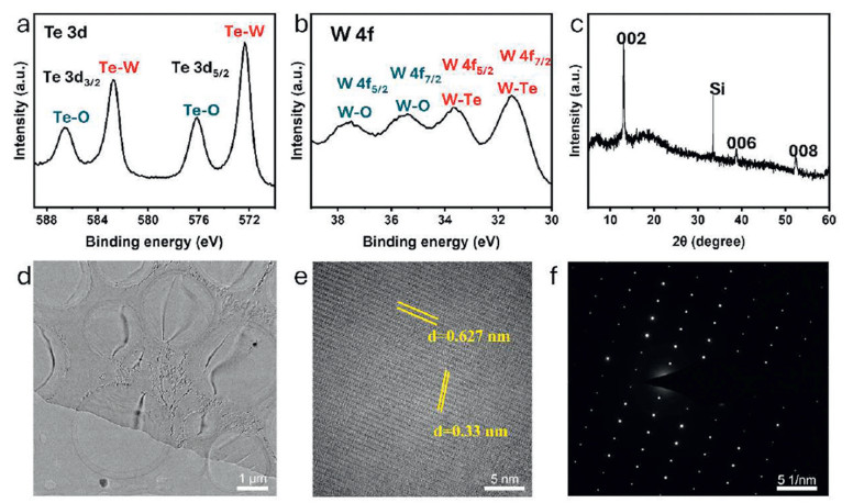 Figure 2.  Chemical states and atomic structure of CVD-grown WTe2. (a, b) XPS spectrum of as-grown WTe2. (c) XRD pattern of as-grown WTe2. (d) Low-magnification TEM image of transferred WTe2 nanosheet. (e) Atomic-resolution TEM image of transferred WTe2 nanosheet. (f) Corresponding SAED pattern of WTe2.