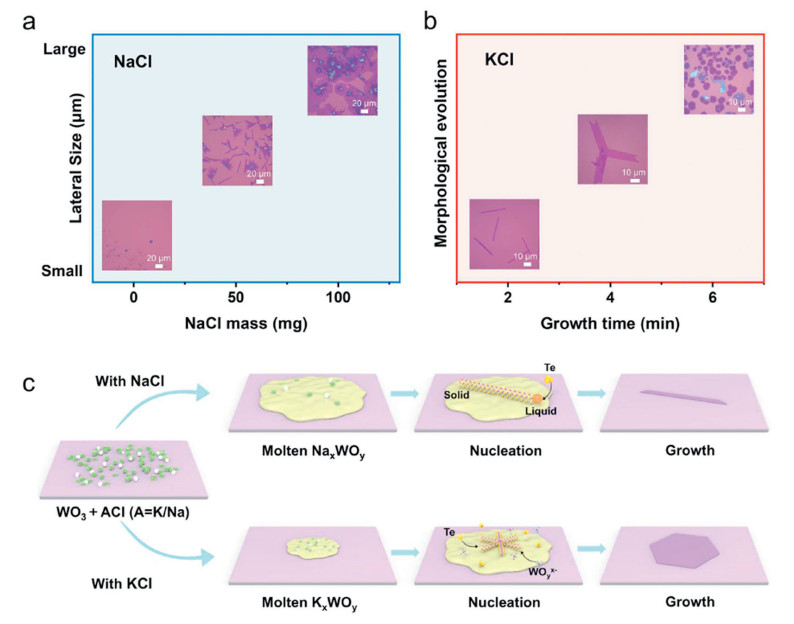 Figure 3.  Growth mechanism of CVD-grown WTe2. (a) Influence of NaCl mass on the WTe2 morphology. (b) Influence of growth time (with KCl) on the WTe2 morphology (c) Schematic diagram of growth mechanism about alkali metal halide types leading to different WTe2 morphologies.