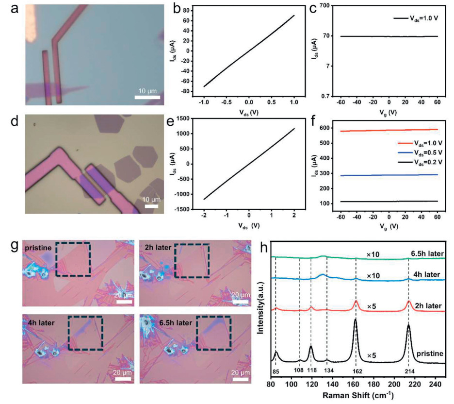 Figure 4.  Electrical properties of WTe2 devices and their air stability. (a) OM image of the WTe2 nanoribbon device and (b) its corresponding output and (c) transfer characteristic curves. (d) OM image of the hexagonal WTe2 nanosheet device and (e) its corresponding output and (f) transfer characteristic curves. (g) OM images of as-grown WTe2 sample after exposure to air for different time periods. (h) Corresponding Raman spectra of as-grown WTe2 sample after exposure to air for different time periods.