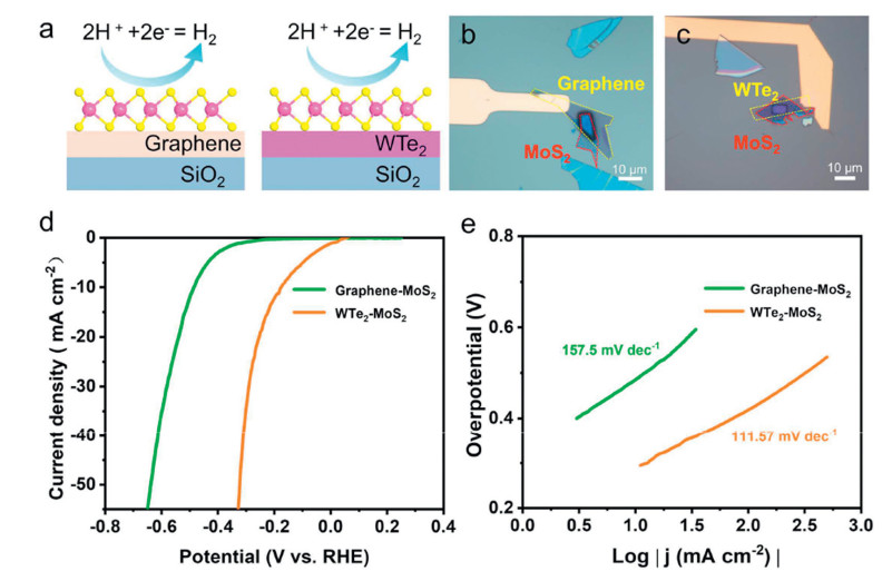 Figure 5.  The effect of WTe2 as electrode material on HER activity of MoS2 (a) Cross-sectional schematic view of configurations of heterostructures. (b) OM image of graphene-MoS2 heterostructure with MoS2 basal plane exposed. (c) OM image of WTe2−MoS2 heterostructure with MoS2 basal plane exposed. (d) Polarization curves of graphene-MoS2 and WTe2−MoS2 heterostructures for the HER in 0.5 mol/L H2SO4. (e) Their corresponding Tafel plots of (d).