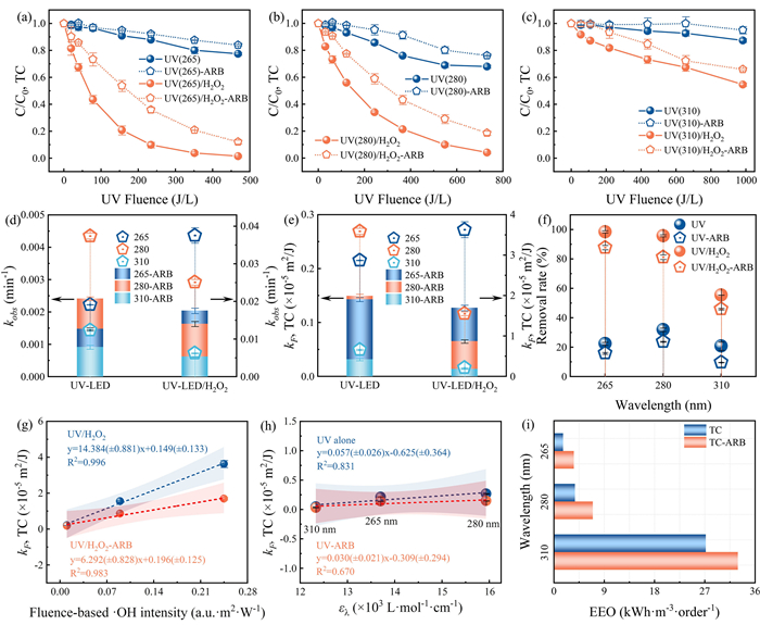 Figure 1.  Degradation kinetics of TC in UV-LED alone and UV-LED/H2O2 systems with or without ARB coexistence at (a) 265 nm, (b) 280 nm and (c) 310 nm. (d) Time-based first-order rate constant (kobs) and (e) fluence-based first-order rate constant (kF) for TC in UV-LED alone and UV-LED/H2O2 systems. (f) Removal rate of TC in UV-LED alone and UV-LED/H2O2 systems at 120 min under studied three wavelengths. Correlations between the kF with (g) fluence-based OH intensity in UV-LED/H2O2 system and (h) ελ of TC in UV-LED alone system. (i) The EEO comparison of TC removal in UV-LED/H2O2 system under studied three wavelengths with or without ARB. Experiment conditions: TC 30 µmol/L, H2O2 10 mmol/L, ARB 3.5 × 106 CFU/mL, 0.9% NaCl solution.