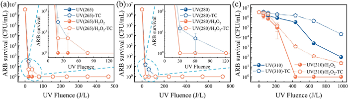 Figure 2  The ARB survival with or without TC coexistence in UV-LED alone and UV-LED/H2O2 system at (a) 265 nm, (b) 280 nm and (c) 310 nm. The inset figures presented enlarged views of ARB survival under low UV fluence. Experiment conditions: TC 30 µmol/L, H2O2 10 mmol/L, ARB 3.5 × 106 CFU/mL, 0.9% NaCl solution. Note: Due to the effective inactivation of ARB, the ARB survival curves at 265 nm demonstrated complete overlap in both the UV-LED alone and UV-LED/H2O2 systems. The ARB survival curves for the UV-LED alone, UV-LED/H2O2, and UV-LED/H2O2-TC systems at 280 nm exhibited complete overlap.