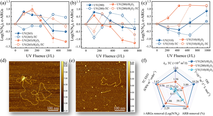 Figure 4  The e-ARGs removal with or without TC coexistence in UV-LED alone and UV-LED/H2O2 system at (a) 265 nm, (b) 280 nm and (c) 310 nm. The AFM images of (d) initial i-ARGs and (e) treated with UV-LED (265 nm)/H2O2 system for 120 min. (f) The performance comparison for kF and EEO of TC, ARB and ARGs removal efficiency, as well as OH yield in UV-LED/H2O2 system at three studied wavelengths. Experiment conditions: TC 30 µmol/L, H2O2 10 mmol/L, ARB 3.5 × 106 CFU/mL, 0.9% NaCl solution.