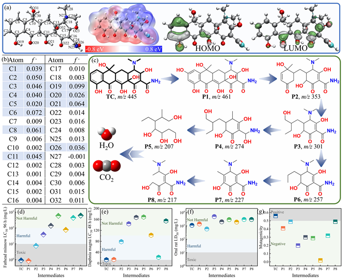 Figure 5.  (a) The structure, electrostatic potential distribution, HOMO and LUMO orbits of TC. (b) Fukui index (f) of TC. (c) Degradation pathway of TC in UV-LED/H2O2 system at 265 nm. The acutMe toxicity of (d) fathead minnow, (e) daphnia magna and (f) oral rat. (g) Mutagenicity of TC and its degradation intermediates. Experiment conditions: TC 30 µmol/L, H2O2 10 mmol/L, 0.9% NaCl solution.