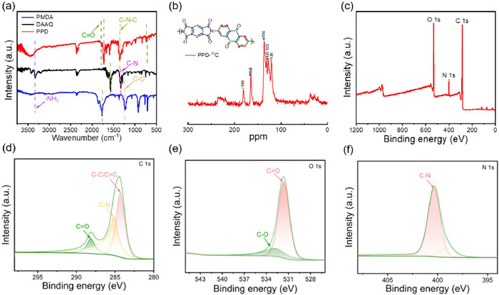 Figure 1.  (a) FT-IR (KBr pellets) spectra of PMDA, DAAQ, PPD. (b) Solid-state 13C NMR of PPD. (c) XPS spectrum of PPD. (d) C 1s spectrum of PPD. (e) O 1s spectrum of PPD. (f) N 1s spectrum of PPD.
