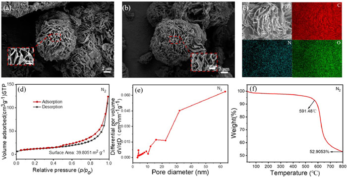 Figure 2.  (a–c) SEM images and elemental mapping images of PPD. (d) N2 adsorption-desorption isotherms, (e) pore-size distribution plots, (f) TGA curves of PPD.