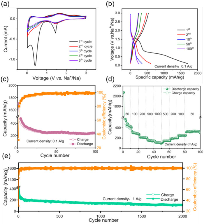 Figure 3.  Electrochemical properties of PPD electrodes for SIBs: (a) The first 5 CV curves of PPD at 0.1 mV/s. (b) Charge/discharge profiles of 1st, 2nd, 10th, 50th, and 100th cycles at 0.1 A/g of PPD. (c) Cycling performance of PPD. (d) Rate capabilities of PPD. (e) Long-term cycling performance of PPD at 1.0 A/g after 2000 cycles.