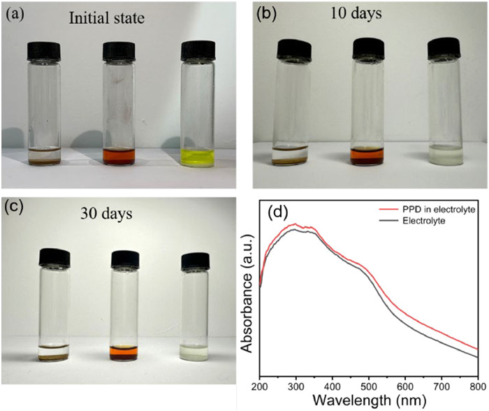 Figure 4.  Digital photos of PPD dispersed in the electrolyte of SIBs for different days: (a) Pristine, (b) 10 days, (c) 30 days. (d) The comparison of UV–vis spectra of PPD in electrolyte with that of pure electrolyte (1 mol/L NaClO4 in EC/DEC (1:1, v/v)).