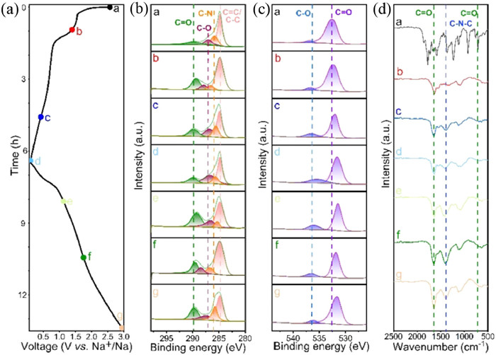 Figure 6.  (a) Discharge-charge profile of PPD electrode at 0.1 A/g in the voltage range of 0.01–3.0 V (vs. Na+/Na) in the first cycle. (b, c) Ex-situ C 1s XPS spectra and ex-situ O 1s XPS spectra. (d) Ex-situ FT-IR spectra under different electrochemical states of PPD.