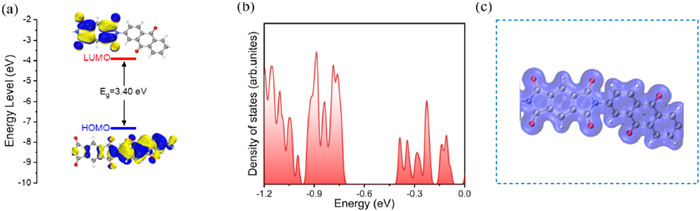 Figure 7  Theoretical simulations in optimized structure of PPD: (a) HOMO/LUMO energy levels; (b) DOS; (c) electron density distribution (blue is positive).