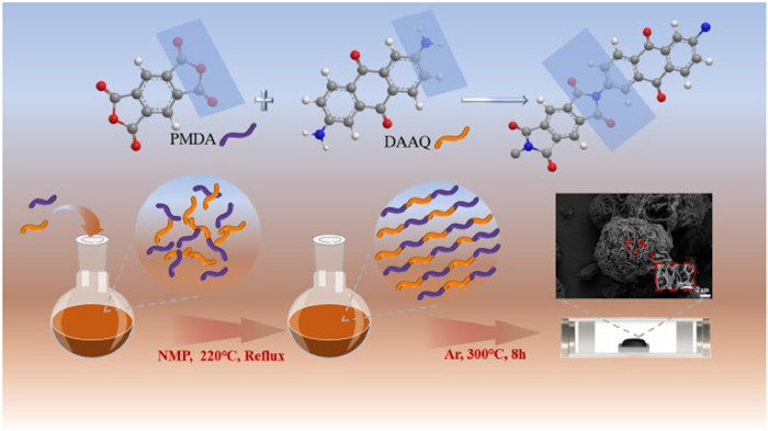 For the preparation of PPD, equimolar (0.0025 mol) pyromellitic dianhydride (PMDA) and 2, 6-diaminoanthraquinone (DAAQ) were dissolved in N-methylpyrrolidone (NMP 30 mL) and the reaction was refluxed under an argon atmosphere for 6 h. The product was subjected to filtration followed by multiple washes with ethanol. It was then dried under vacuum at 120 ℃ for 12 h. After heat treatment in nitrogen at 300 ℃ for 8 h, the resulting product was ground to give a yellow powder with an average yield of 86.5% (Scheme 1).