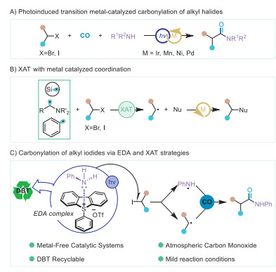 • Using the inexpensive and readily available carbon monoxide as a C1 synthon to construct amide-containing skeletal compounds with a wide range of functionalities is a facile synthetic method [1-4]. To date, aminocarbonylation strategies for aryl and benzyl halides have been successfully established and even industrially applied [5-7]. However, the aminocarbonylation of alkyl halides has been slow to develop compared to aryl halides. The primary reason is that alkyl halides are highly susceptible to β-H elimination from alkyl-metal intermediates generated by metal-dependent activation [8-11]. This has changed in recent years with the rapid development of photocatalysis. In 1997, Sonoda's group reported the light-mediated, metal-free catalyzed esterification of alkyl iodide substituents [12]. Although the reaction was limited by product, high-energy light sources, and high-pressure carbon monoxide, it provides a direction for the further development on carbonylative transformation of alkyl halides. As photocatalysis has experienced impressive progresses during past decades, catalytic systems for the amidation of alkyl halides under visible light have been developed using iridium, manganese, nickel, palladium, and other metals (Fig. 1A) [13-16]. Although these strategies have been reported to improve the utilization of alkyl halides for carbonylation, transition metal catalysts are still required in general.