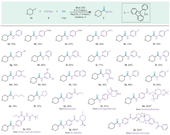 We set out to explore the feasibility of this light-mediated exogenous catalyst-free reaction design using 4-iodooxane 1a and aniline 2a as reaction substrates, and after systematic collation of the reaction transformation data, the reaction conditions are summarised in Table 1 (for more details, see Supporting information). Initially, in order to better enable the reaction to occur, we used 2 equiv. of aniline and phenyl sulfonium salts as electron donors and acceptors of the EDA complex, acetone (2 mL), and irradiated with a 15 W blue light lamp under a 60 bar CO atmosphere, and successfully detected the target product of the reaction (Table 1, entry 1). To investigate the effect of changing the reaction environment on the reaction, we replaced acetone with other solvents and found a slight decrease in yield (Table 1, entry 2). Immediately afterwards, we replaced the cesium fluoride with sodium carbonate and, to our surprise, obtained a significant increase in yield (Table 1, entry 3). Based on this, we then carefully screened sodium ion bases, carbonate ion bases and organic bases, but did not obtain better results (Table 1, entries 4–6). To reduce energy consumption, we chose to reduce the reaction time to 24 h and observed no significant change in yield (Table 1, entry 7). To verify the initial idea, we also reduced the carbon monoxide pressure to 1 bar and adjusted the dosage of aniline and phenyl sulfonium salts to 1.2 times and found that the reaction gave the target product in a high yield of 76% (Table 1, entries 8 and 9). This is a good demonstration of the high efficiency of the XAT strategy and the inter-radical coupling.