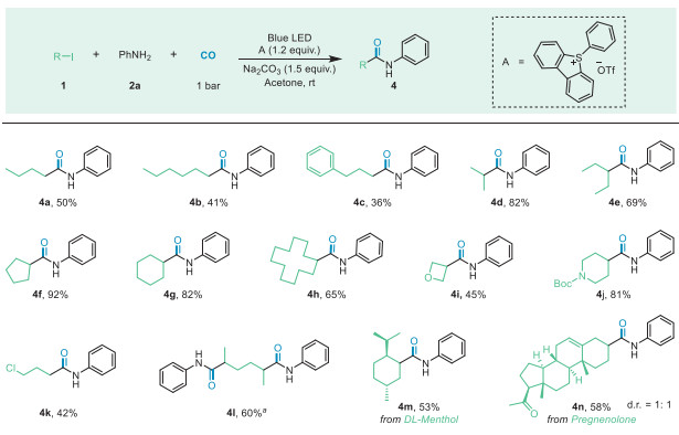 Figure 3  Substrate scope of alkyl iodides. Reaction conditions: 1 (0.2 mmol), 2a (1.2 equiv.), A (1.2 equiv.), Na2CO3 (1.5 equiv.), CO (1 bar) in acetone (2 mL), irradiation with a 15 W blue LED at r.t. for 24 h, isolated yields. a 2a (2.4 equiv.), A (2.4 equiv.), Na2CO3 (3 equiv.).