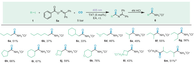 Inspired by the above reaction results, we also learned that o-benzoyl oxime can generate phenyl radical and imine radical respectively through energy transfer process under light induction [26, 27]. We envisage that o-benzoyl oxime could act as both a XAT promoter and a radical coupling agent, and most importantly, the product obtained is a primary amide, since primary amides play an important role as starting reagents in many reactions. We are excited that the reaction is successful under non-metallic catalysis and low carbon monoxide pressure. After a series of condition optimisations to determine the optimum conditions, we started to test the compatibility of the reaction with different alkyl iodides (Fig. 4). Like the reaction results above, both primary and secondary alkyl iodides can react well. However, secondary carbon iodides are more reactive than primary carbon iodides, and the corresponding primary amide products (6e-6l) were obtained in greater than 50% yields. It is worth mentioning that when the iodide was modified with heteroatoms it has essentially no effect on the reaction outcome.