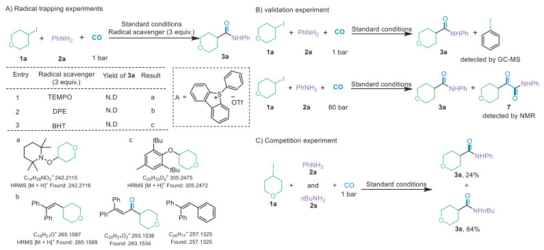 To understand the specific transformation mechanism of the above reaction, we performed some control experiments (Fig. 5). First, the radical scavengers TEMPO, DPE and BHT were added to the system under standard reaction conditions. As a result, the formation of the target product could not be detected, but radical scavenging intermediates were detected by HRMS (Fig. 5A). Through the intermediates obtained by the radical scavenger, it is clearly observed that phenyl radical, alkyl carbon radical and acyl radical were generated in the system. The reaction was performed under standard conditions, we detected the target product and observed the formation of a large amount of iodobenzene. This result confirmed the presence of phenyl radical and its role as XAT promoter (Fig. 5B). When the carbon monoxide pressure of the reaction was increased to 60 bar, the formation of dicarbonyl product could be detected from the reaction mixture. This result confirmed that alkyl carbon radical and nitrogen radical were successfully generated by the EDA and XAT strategies, and radical coupling occurred. Competition experiments confirmed that more electron-rich alkylamines were more reactive and could serve as better electron donors for EDA (Fig. 5C).
