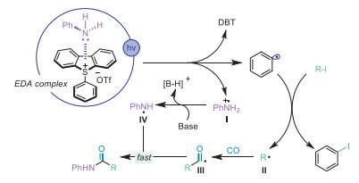 Following the results of the controlled experiments described above and the relevant literatures [22-33], we proposed a specific transformation mechanism for the occurrence of the reaction (Fig. 6). We believe that the reaction is started initially by the EDA complex, which forms a complex between the phenyl sulfonium salts and aniline, and that under visible light irradiation the EDA complex is excited to form the phenyl radical and the aniline cation . Subsequent activation of alkyl iodides by phenyl radicals to form alkyl carbon radicals . In an atmosphere of carbon monoxide, the alkyl carbon radical traps carbon monoxide to form the acyl radical . Finally, the aniline cation was deprotonated to give nitrogen radical , which then rapidly coupled with acyl radical to afford the desired amide product.