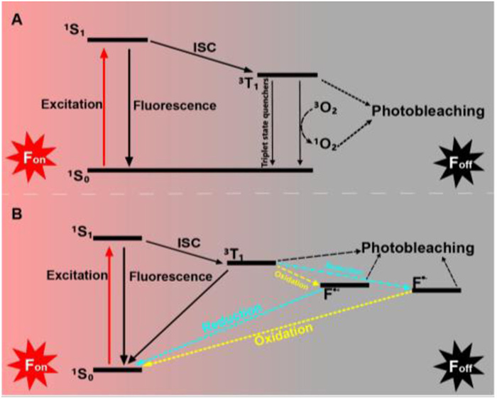 Figure 2. Photo-switching process of common organic fluorophores. (A) In the "on" state, fluorophores transition from 1S0 to 1S1. From the 1S1 state, fluorophores can return to the 1S0 state while emitting fluorescence through radiative processes, or they may undergo nonradiative vibrational relaxation to the 1S0 state, a process also referred to as thermal deactivation. Alternatively, they can experience ISC to a non-fluorescent state 3T1. The 3T1 state can be quenched to the 1S0 state by triplet-triplet energy transfer with 3O2 to generate 1O2, resulting in photobleaching. (B) Redox-active buffers can be used to depopulate the 3T1 state by electron transfer either through oxidation forming a radical cation (F•+) or through reduction yielding a radical anion (F•−). The fluorophores then return to the 1S0 state through inverse redox reactions.The second pathway occurs through the formation of reactive short-lived radicals (F•) generated by excited-state-mediated photoionization (Fig. 2B). The higher excited singlet state (1Sn) and triplet state (3Tn) are closely associated with the photoionization rate. Transitions to the triplet states (3T1 and 3Tn) promote electron transfer reactions, resulting in photobleaching and irreversible degradation of fluorophores due to radical formation. The rapid return to the singlet ground state is essential for effectively inhibiting side reactions that contribute to photobleaching. Consequently, various combinations of reducing agents, antioxidants, and triplet state quenchers have been investigated to minimize the generation of free radicals and prevent oxygen-independent photobleaching.