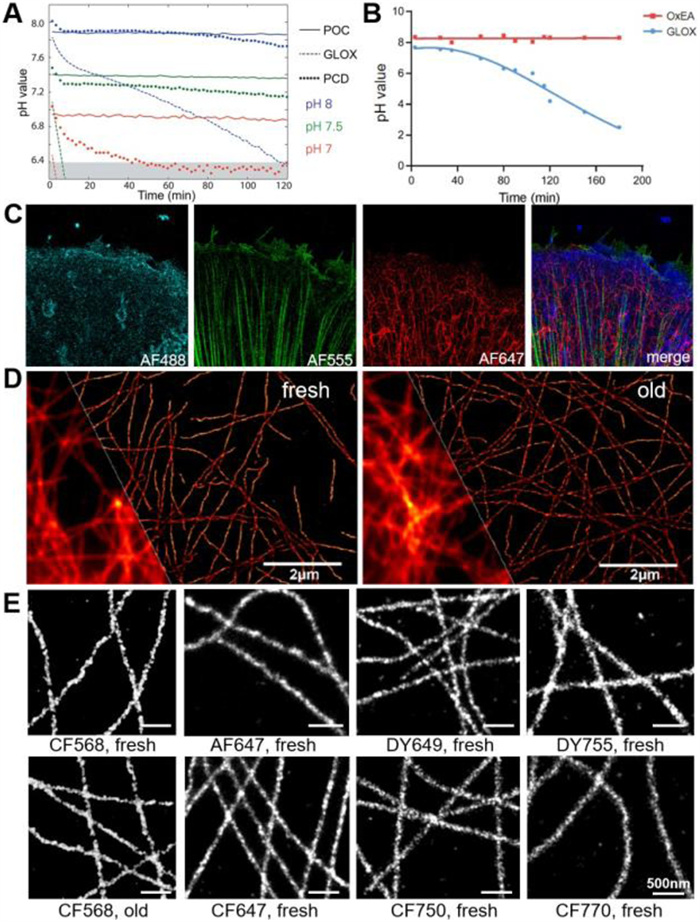 Figure 4. Effects of oxygen scavenging system. (A) pH values across time in the POC (solid), GLOX (dashed), and PCD (dotted) systems with initial pH values of 8 (blue), 7.5 (green), and 7 (red). Reproduced with permission [60]. Copyright 2012, American Chemical Society. (B) pH values across time in the OxEA and GLOX systems. (C) Three-color super-resolution image of β4 integrin (red), keratin (green), and plectin (blue) using the OxEA system. Reproduced with permission [61]. Copyright 2016, Public Library of Science. (D) Super-resolution images of microtubules immunostained with AF647 using fresh (left) and 28-day-old (right) imaging buffers containing sodium sulfite. The bottom left insets are diffraction-limited images. Reproduced with permission [66]. Copyright 2018, bioRxiv. (E) Super-resolution images of microtubules immunostained with different fluorophores using imaging buffers containing sodium sulfite. Here "fresh" means the buffer was prepared freshly, while "old" means the buffer was frozen for 1 week, thawed overnight in the fridge, and then used after another 4 days. Reproduced with permission [67]. Copyright 2022, American Chemical Society.In addition to above-mentioned enzyme-based oxygen scavenging systems, non-enzyme components can be also used to consume oxygen. In 2018, Hartwich et al. [66] proposed a high-refractive-index imaging buffer composed of 80%–90% glycerol, β-mercaptoethylamine (MEA), and sodium sulfite, which reacts with dissolved oxygen to generate sodium sulfate without causing acidification (Fig. 3D). This imaging buffer is cost-effective and does not require fresh preparation, allowing for super-resolution imaging even 28 days after preparation (Fig. 4D). The authors demonstrated that sodium sulfite could be also used in aqueous buffers, achieving a similar reduction in background and improvement in localization precision. In 2022, Abdelsayed et al. [67] utilized sodium sulfite as an oxygen scavenger in an aqueous imaging buffer, successfully capturing high-quality super-resolution images of microtubules that were immunostained separately with various fluorophores including CF568, AF647, CF647, Dylight (DY)649, CF750, DY755, and CF770 (Fig. 4E). This work highlighted the compatibility and effectiveness of the proposed imaging buffer in STORM.