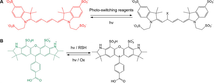 Figure 5 Photo-switching mechanism of dyes. (A) Photo-switching reactions of cyanine fluorophores (e.g., AF647). Reproduced with permission [70]. Copyright 2024, Wiley-VCH. (B) Photo-switching reactions of rhodamine fluorophores (e.g., AF532). Reproduced with permission [72]. Copyright 2022, Wiley-VCH.