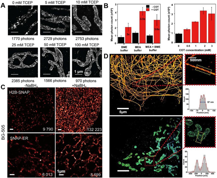 In 2013, Vaughan et al. [96] validated that the fluorescence of Cy5 and its structural analogs could be reversibly quenched by tris(2-carboxyethyl)phosphine (TCEP), a commonly used reducing agent for disulfide bonds in proteins and small molecules. Using Cy5 as an example, they observed that TCEP reacts with the polymethine bridge of Cy5 through a 1,4-addition process, forming a covalent adduct that quenches its fluorescence. Upon UV illumination, the adduct dissociates, restoring Cy5 to its fluorescent state. The authors successfully obtained super-resolution images of mitochondria immunostained with AF647 using TCEP in the imaging buffer (Fig. 6A). Thereafter, TCEP-induced photo-reversible quenching has become pivotal for acquiring top-grade super-resolution images and facilitating easy-to-implement cellular internalization assays [97]. The same year, Olivier et al. [98] suggested the use of the polyunsaturated hydrocarbon cyclooctatetraene (COT), a triplet state quencher, to optimize the imaging performance in STORM. By imaging microtubules immunostained with AF647 in the presence of varying concentrations of COT in the imaging buffer, the authors discovered that COT can not only prevent oxygen-mediated photobleaching but also enhance the mean photon efficiency of AF647 by up to 3.5-fold in a dose-dependent manner (Fig. 6B), leading to improved localization precision. This enhancement was observed to be consistent across different types of thiols used to induce blinking, such as MEA, BME, or their mixtures. In 2014, Carlini et al. [99] utilized sodium borohydride (NaBH4) to quench cell-permeable rhodamine dyes. NaBH4 is a mild, inexpensive reducing agent widely used in chemistry, both in labs and industry [100,101]. The experimental results illustrated that the fluorescence of the dyes was quenched after reduction by NaBH4 and subsequently recovered upon oxidation. Notably, when these fluorophores were targeted to proteins within live cells, the fluorescence recovery occurred spontaneously, without the need for exogenous chemicals or light stimulation. This process generates a greater number of photons (Fig. 6C), markedly refining the localization precision.