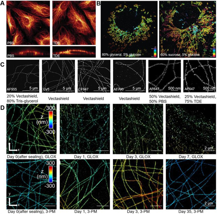 In 2007, Staudt et al. [108] introduced 2,2′-thiodiethanol (TDE) as a medium for imaging. TDE, a derivative of ethylene glycol, is non-toxic and can be mixed with water in any proportion, allowing for precise adjustments to the sample's refractive index. The incorporation of TDE effectively mitigates the issue of index mismatch, enabling high-resolution imaging within samples (Fig. 7A). Furthermore, the TDE solution is compatible with various cell preparation and staining techniques, acts as an antioxidant, and helps maintain the photon efficiency of most fluorophores. Therefore, numerous studies in STORM utilize TDE to optimize the refractive index of imaging buffer solutions [104,109,110].