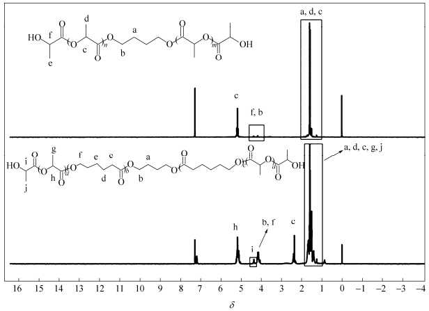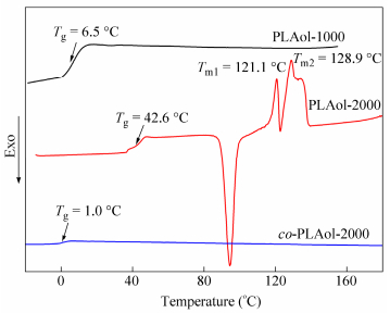 Five bio-based PLA and copolymer diols (PLAol-1000, 2000 and co-PLAol-1000, 2000, 3000) were synthesized by the above-mentioned method. The structures of PLAol and co-PLAol were confirmed by 1H-NMR, as shown in Fig. 1. The signals at d=5.17 are ascribed to the―CH―connected to C=O in PLAol and co-PLAol, while the signals at d=2.32, 1.64, 1.29, 1.62 and 4.08 are assigned to protons on―C=O―CH2―CH2―CH2―CH2―CH2―O―in co-PLAol, respectively[18]. Figure 2 shows the DSC curves of the synthesized PLAol and co-PLAol. PLAols with Mn of above 2000 have multi-melting peaks, and their Tg values increase with the increase of Mn. In comparison, co-PLAols are amorphous and have relatively low Tgs. Instead of an elastomer, the bio-PUs synthesized from PLAols and TDI were rigid solid at room temperature. To obtain high performance bio-PUs, co-PLAols were therefore chosen to be used as the soft segments.