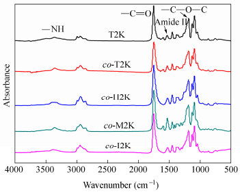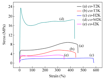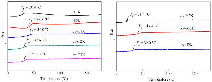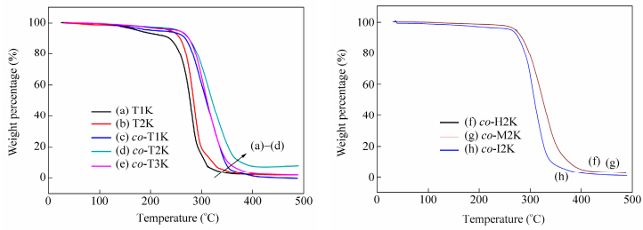 Tg (℃) T5% (℃) Tmaxa (℃) Tensile strength (MPa) Elongation (%) Young’s modulus (MPa) T1K 28.9 182.7 281.5 - - - T2K 42.7 239.7 288.0 - - - co-T1K 36.0 214.9 293.6 - - - co-T2K 32.6 256.3 319.0 8.8 460 217.3 co-T3K 33.7 255.4 307.3 5.6 440 84.1 co-H2K 21.4 270.8 329.4 2.2 580 22.0 co-M2Kco-I2K 43.8 32.0 274.1 261.9 302.2 306.4 23.5 3.5 430 350 380.8 137.5 a Tmax is the temperature of the maximum rate of weight-loss of the samples. Table 2. Thermal and mechanical properties of bio-PUs samplesThe effect of different soft and hard segments on the thermal stability of the obtained bio-PUs was investigated by TGA, as shown in Fig. 5. Their weight loss temperatures (T5%, Tmax) are listed in Table 2. Instead of PLAols as the soft segment, co-PLAols improved the thermal stability of the synthesized PUs. In comparison, the type of diisocyanates has a little impact on the thermal stability of the obtained PUs. Furthermore, the T5% and Tmax of the bio-PUs synthesized from co-PLAols are above 200 and 300℃, respectively, indicating the good thermal stability of these bio-PUs.