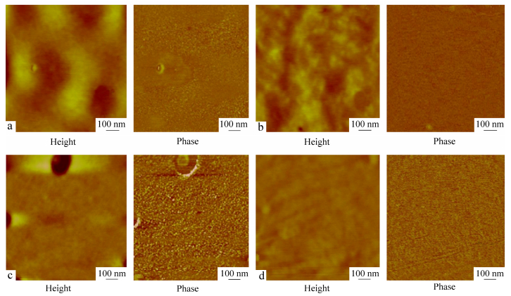 Figure 6 displays the typical stress-strain curves of the obtained bio-PUs from co-PLAols, and their tensile strength, elongation and Young’s modulus are summarized in Table 2. Obvious yielding was observed before break. From Table 2, the tensile strength and modulus of the samples decreased with the molecular weight of soft segment increasing, from 8.8 MPa and 217.3 MPa for co-T2K to 5.6 MPa and 84.1 MPa of co-T3K, respectively. Compared with TDI, MDI and IPDI-based PUs, HDI-based PUs have the highest elongation at break, possibly due to the long aliphatic carbon chains of HDI, resulting in good flexibility of the PU chains. From Fig. 6 and Table 2, we can conclude that the mechanical properties of the obtained bio-PUs could be adjusted in a wide range. The tensile strength and elongation of co-M2K synthesized from co-PLAol-2000 and MDI were 23.5 MPa and 430%, respectively, which are comparable to commercial petroleum-based polyester PUs (Desmopan® 400 serials) from Bayer Corporation[20]. The superior mechanical properties are mainly attributed to the well-defined phase separation morphology, as shown in Fig. 7. Compared with TDI, HDI and IPDI-based PUs, the micro-phase of MDI-based PUs becomes more developed.