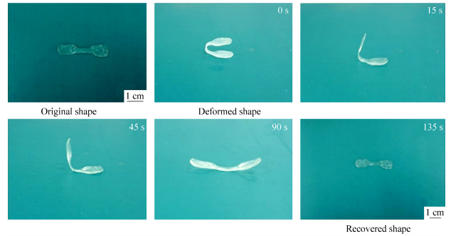 The shape memory properties of the obtained bio-PUs at body temperature are also measured. Figure 8 shows the shape recovery process of co-I2K at body temperature (37℃). The sample was changed into a bending shape at 37℃and then cooled rapidly below Tg using liquid nitrogen and it reached the original shape state in about 2 min at 37℃.