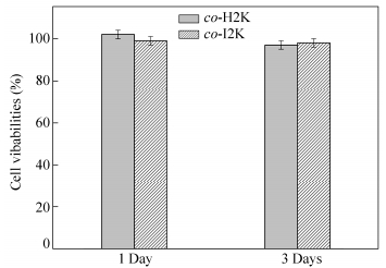 To determine the cytotoxicity of the synthesized bio-PUs, the Alamar blue assay by hMSCs was used, as shown in Fig. 9. It can be clearly seen that co-H2K and co-I2K showed no cytotoxicity, and their cell vibabilities were nearly closed to 100% after incubation for 1 and 3 days. This result indicates that the synthesized bio-PUs are cytocompatible to hMSCs[21].