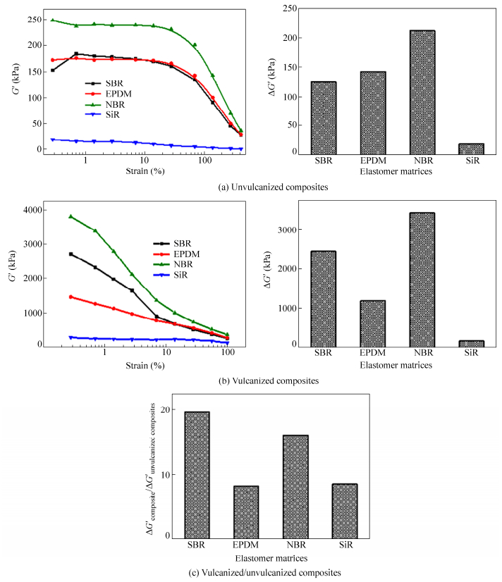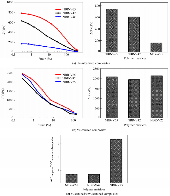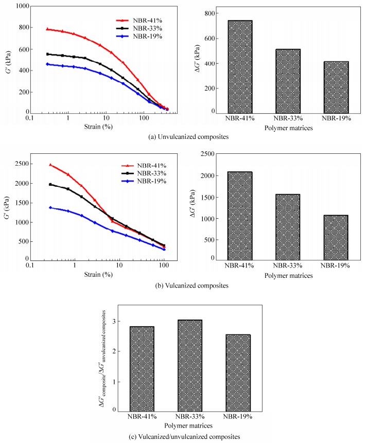 As previously reported, the network of filler can be characterized by the Payne effect[18]. Composites with stronger filler network show stronger Payne effect. In other words, composites with stronger filler network show higher dynamic modulus (G’) at very small strains, their filler network breaks down fast as the exerted strain increases and their G’decreases remarkably once the filler network breaks down. For elastomer-filler system, dynamic modulus of the unvulcanized composite (unvulcanized blend) mainly depends on the filler network and the filler-elastomer bonding, while that of vulcanized composite depends on the combined effect of the filler network, the filler-elastomer bonding and elastomer network. This can be shown as the following Eq.(1).
