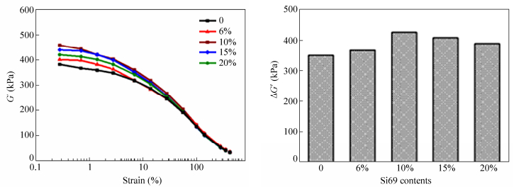 Si69 was chosen to evaluate the influence of the amount of silane coupling agent on the dispersion and network formation of FS in elastomers. As shown in Fig. 10, the Payne effects of Si69 modified FS/SBR unvulcanized composites are much stronger than that of the unmodified FS/SBR unvulcanized composite. As the loading of Si69 increases, the resulting filler network of the unvulcanized composite becomes stronger. The strongest filler network is achieved when the loading of Si69 is 10% of the weight of FS, above that loading any increase in Si69 loading will result in a weakened filler network. That is because during surface modification process, the excessive Si69 adsorbed on single crystals or crystal bundles of FS may form multi-layer adsorption, which is averse to the filler network formation. On the other hand, the functional groups of FS are limited thus excessive Si69 cannot contribute to the separation of extra FS bundles to increase the amount of filler network constructing units (single crystals). So excessive Si69 will weaken the bonding between single crystals and thus weaken the filler network, besides it can also increase the cost of the composite.