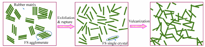 Studies have proven that particles with nano-dispersion may re-aggregate when the elastomer matrix is in rubbery state or viscous state during processing. The re-aggregation can result in a universal stereo network of fillers which can lead to high modulus in both vulcanized composite and unvulcanized composite. Excessive re-aggregation may lead to a transition from universal stereo network to local stereo network and finally densely-packed agglomerates. On one hand, re-aggregation is controlled thermodynamically: the large difference in surface energy between filler and matrix, high volume fraction of filler, small particle size and large shape coefficient favor the filler re-aggregation. On the other hand, re-aggregation is also controlled kinetically: the low matrix viscosity and small ligament between fillers would contribute to filler re-aggregation. FS in matrix like NBR form the network structure because of the following three reasons. First, the surface energy of FS is lower than traditional fillers thus the physical motivation of filler re-aggregation is low. Second, FS is very easy to dissociated into single crystals and the high viscosity of matrix and large ligament between fillers further prevent the re-aggregation of the fillers during vulcanization, favoring the achievement of a good dispersion of FS. Third, the FS single crystals are rather easy to form network owing to the large aspect ratio. Thus, FS may form a network structure rather than large aggregates.